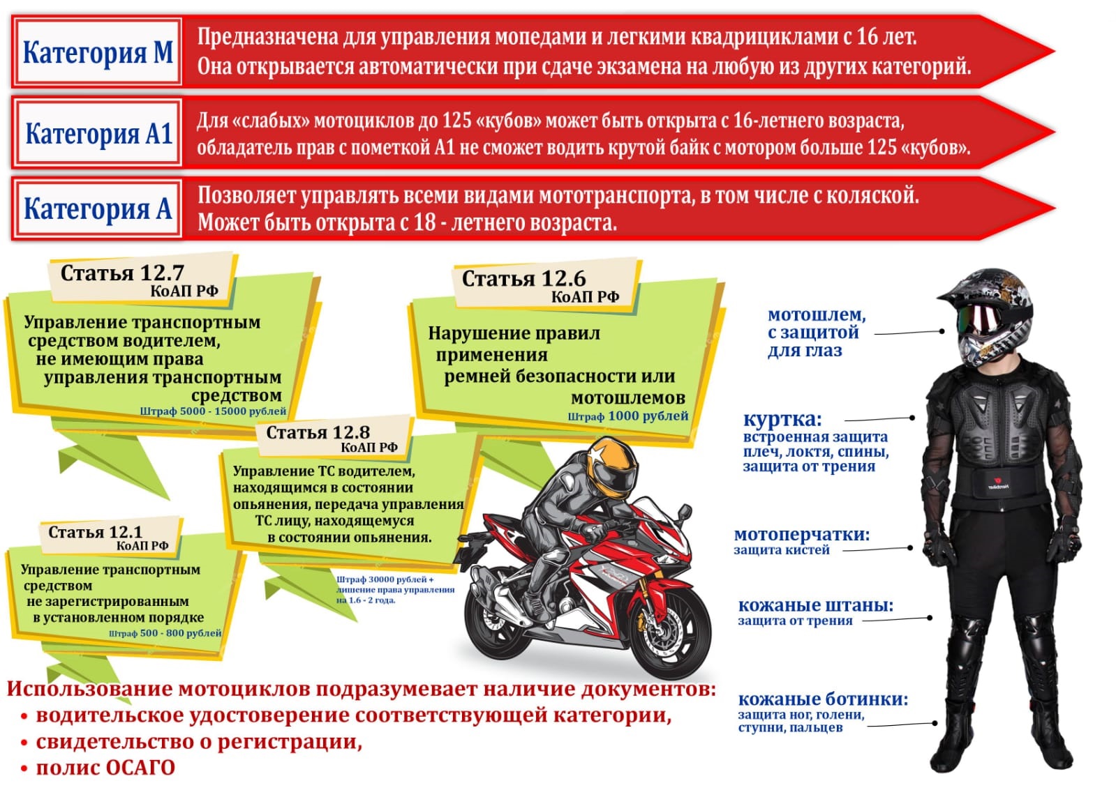 Управлять мопедом могут лица, достигшие 16-летнего возраста при наличии водительского удостоверения категории «М». Для управления мотоциклом, необходимо достигнуть возраста 18 лет и получить водительское удостоверение категории «А», за исключением мотоциклов с объемом двигателя менее 125 кубических см - права категории А1 на этот транспорт можно получить в 16 лет. Что касается кроссовых мотоциклов или пит-байков то, эти средства передвижения относятся к спортивному инвентарю и предназначены только для движения на специально отведённых закрытых площадках. На дорогах общего пользования двигаться на них запрещено. Сотрудники Госавтоинспекции напоминают, что согласно ч. 1 ст. 12.7 КоАП РФ, за управление транспортным средством водителем, не имеющим права управления (за исключением учебной езды), предусмотрен штраф в размере от 5000 до 15 000 рублей с задержанием транспортного средства и помещением его на специальную охраняемую стоянку. Если несовершеннолетний водитель старше 16 лет, штраф выписывается на его имя. Если младше - ответственность несут его законные представители. Собственники мототехники, которыми чаще всего являются родители, могут быть привлечены к ответственности за передачу управления транспорта, лицам не имеющим права управления. Сумма штрафа за это нарушение 30000 рублей. В любом из этих случаев сотрудники приглашают на место задержания родителей юного водителя. Инспекторы по делам несовершеннолетних составляют в отношении родителей подростков протоколы по ч. 1 ст. 5.35 КоАП РФ «Неисполнение родителями или иными законными представителями несовершеннолетних обязанностей по содержанию и воспитанию несовершеннолетних». Собранные материалы направляются на комиссию по делам несовершеннолетних и защите их прав. Госавтоинспекция обращается к родителям: не приобретайте детям мототехнику до достижения ими соответствующего возраста и получения водительского удостоверения, а также не допускайте управления детьми транспортными средствами. Берегите жизни и здоровье своих детей!